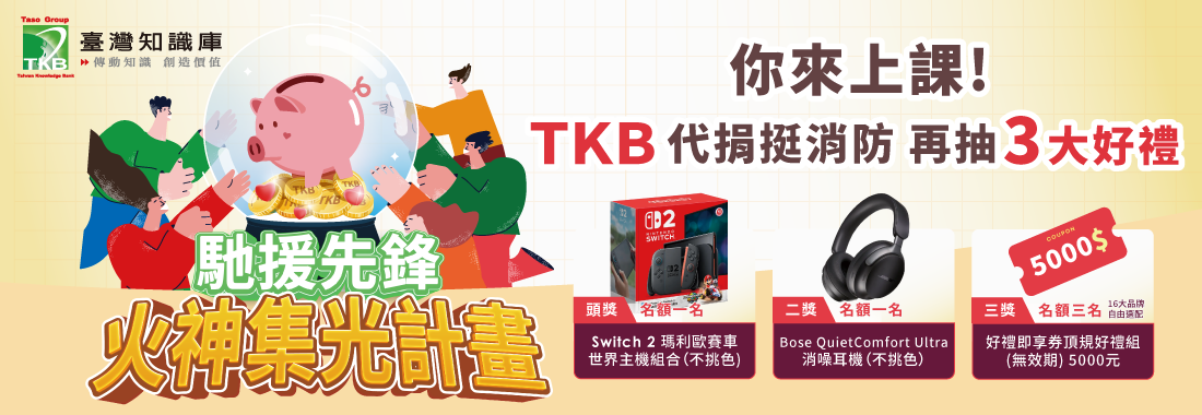 【2025 馳援先鋒火神集光計畫】年終活動開跑!2025/11/01-2025/11/30 凡報名TKB全品項課程,台灣知識庫就幫您捐出學費的千分之三,回饋消防人員,協助抗災!且學費滿3萬元者即可抽: